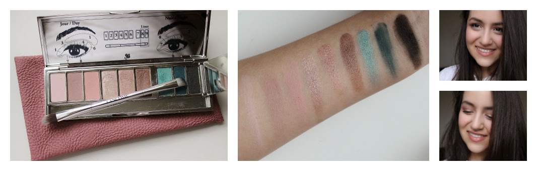 Say hello to one of the cutest and most well laid out palettes around. This is the Lancome My French Palette which is new for Spring only (limited edition). This slim, metal palette opens up to reveal six pink and bronze shades, underneath a hidden metal cover/flap are three blue shades. Immediately, this palette gets a massive thumbs up as the metal cover limits the brighter, darker shades from mixing into the lighter shades in the palette. The palette also contains a leaflet demonstration and a brush. The brush... I like it but it isn't the best brush around, however it does pack on colour nicely and the angled side is quite thin and sharp so you can create a precise liner look with this brush.